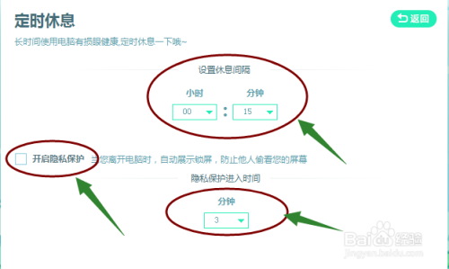 这个里面有三种设置,包罗歇息距离时候、隐私庇护、隐私庇护进入时候三项内容,按照本身的需要设置即可。