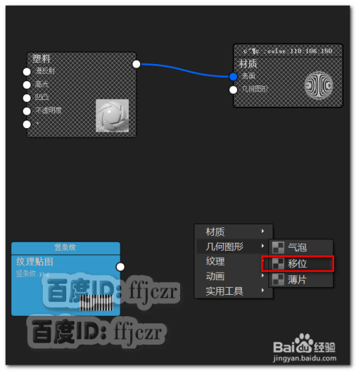 将贴图调整到合适的位置后,再次按C键打消贴图在模子上的显示。在节点编纂器中点右键,在弹出的对话框中选择几何图形中的移位。