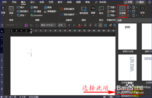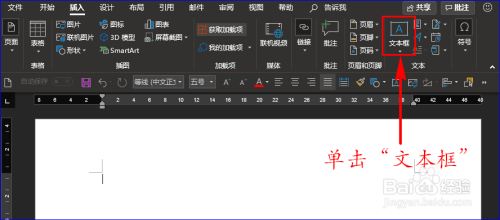 打开Word文档,点击“插入”菜单,在其子菜单中选择“文本框”。如图所示: