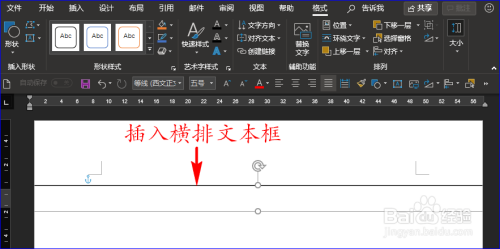 接着在“文本框”的扩展框中选择“绘制横排文本框”,在文档中画一个横排文本框(文本框宽度拖至文档摆布两侧,高度不要太高)。如图所示: