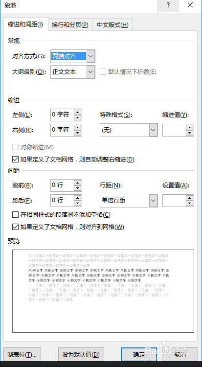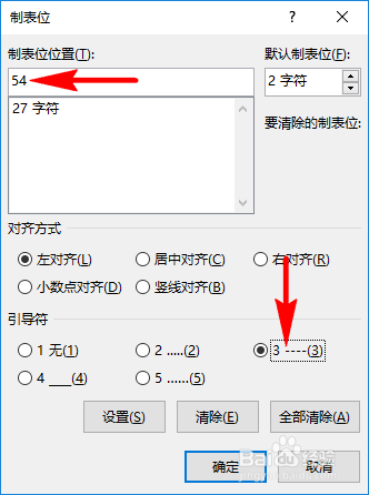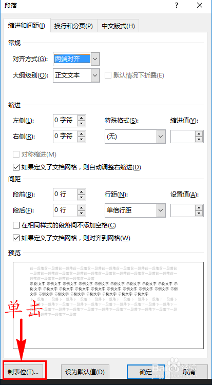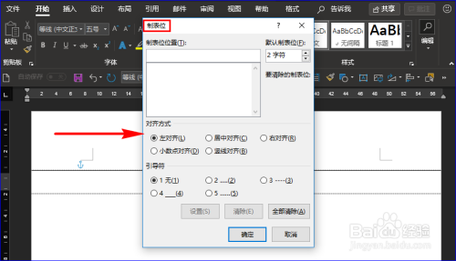 然后在对话框中找到“制表位”选项并单击,这时将会弹出“制表位”对话框。如图所示: