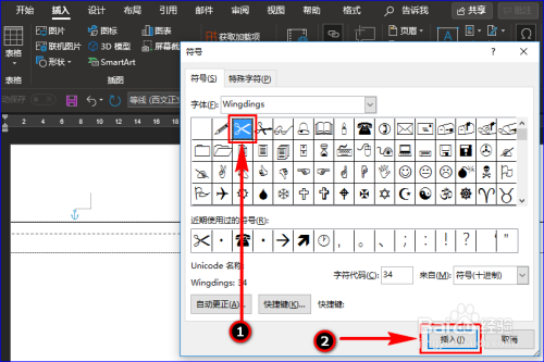 再次单击“插入”菜单,在其子菜单中找到“符号”—“其他符号”并单击。然后在弹出的对话框中选中一种“铰剪”符号,点击“插入”按钮,如许文档中就插入铰剪了。如图所示: