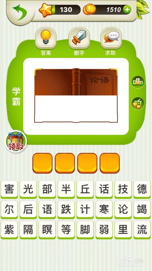 图片上有一本书,可是这个书只有一半,而书的名字又是论语,那么我们就可以想到当作语,半部论语,