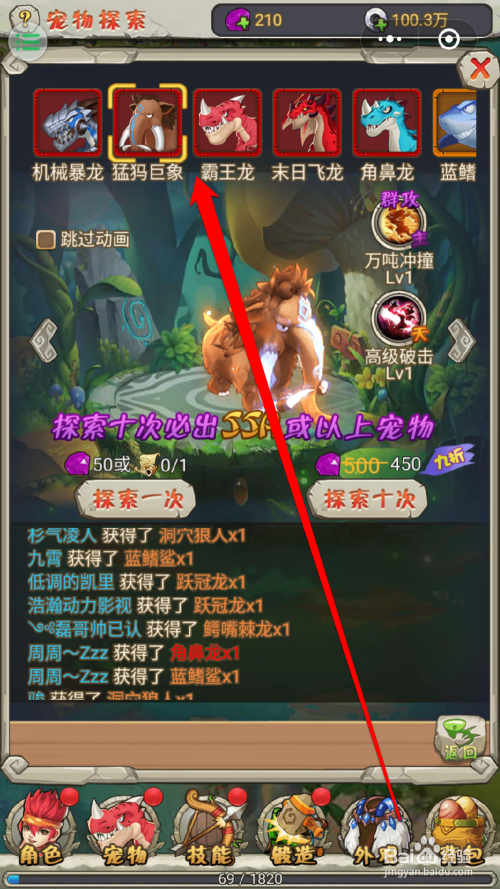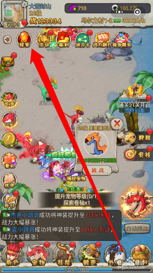 在石器时代游戏中,获得一个好的宠物,也是进级做使命的好辅佐。那么怎么获得这些宠物以及宠物的口粮呢,进入摸索功能,可以多次挑战获得奖励。