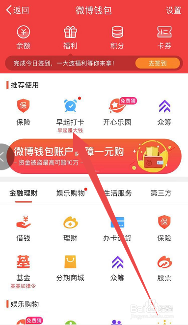 在微博钱包内,我们可以看见有很多多少活动,夙起打卡的活动就在保举利用的位置。