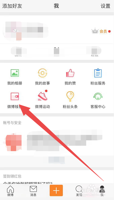 进入“我”的页面之后,可以在这个页面看见很多多少和小我有关的设置。我们点击中心部门的“微博钱包”选项,打开微博钱包。