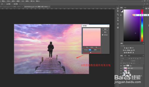 选中上一步有选区建立的图层,将该图层的天空部门选中拖入到人物照片PS文档的画布中,生当作图层1.