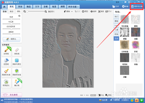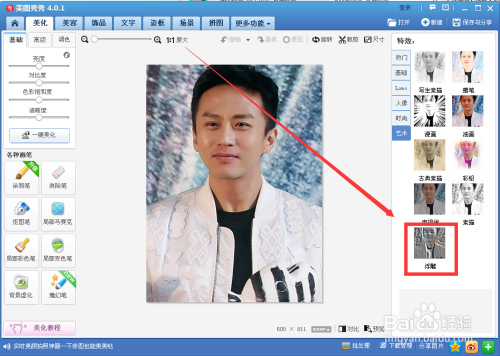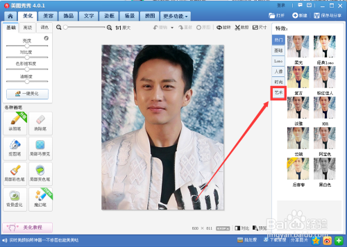 这时,待处置的图片已经显示在软件编纂窗口。在右边功能栏找到并单击”艺术”