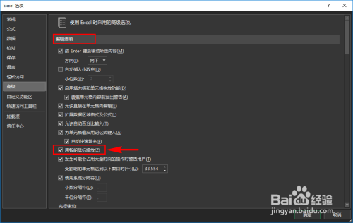 在高级菜单设置选项中,我们找到“编纂选项”栏目,然后再在里面继续找到“用智能鼠标缩放”选项。