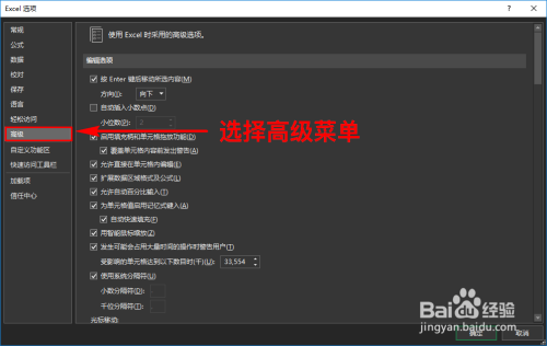 打开excel选项弹窗面板后,我们在左侧直接选择“高级”菜单,然后打开高级的菜单设置选项。
