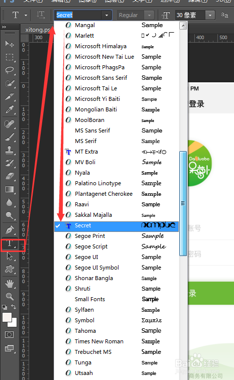打开PS软件,选择‘字体’东西,点击头部东西栏的‘字体下拉框’