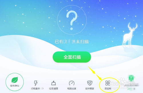 打开金山毒霸本家儿界面今后,点击本家儿页面下方最右边的百宝箱,打开百宝箱功能。