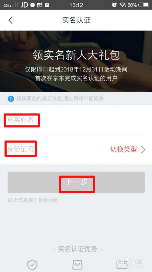 进入到「实名认证」页面,填写「真实姓名、身份证号」,再点击「下一步」按钮。