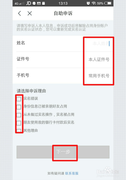 接着进入到「自助申诉」页面,填写「姓名、证件号、手机号」,再选择一个申诉的来由、并点击「下一步」进入下一个页面。