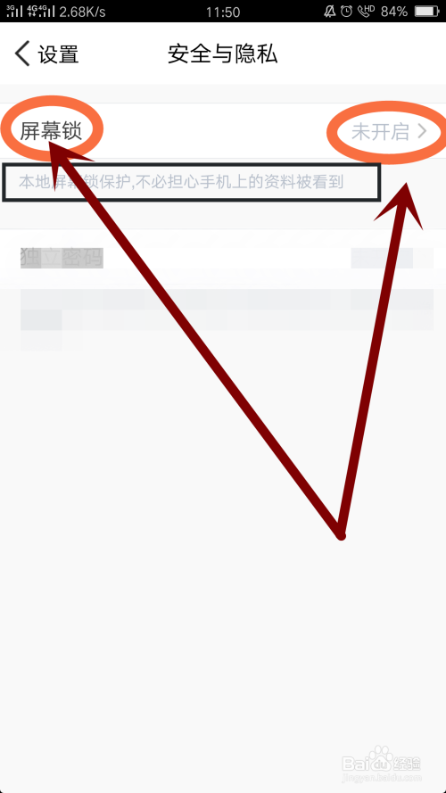 在平安与隐私页面,点击打开屏幕锁,设置庇护密码,如图所示