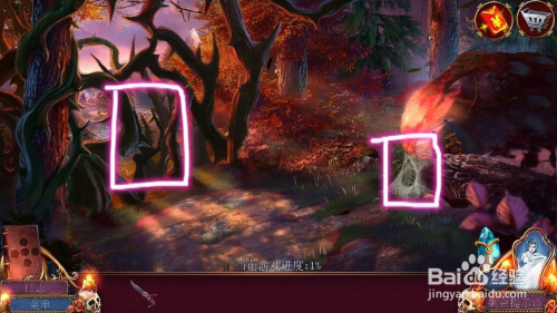 小刀割断绳索落地,在左侧荆棘处拿取【细枝】,拨开岩石四周的蜘蛛网拿取【手套】