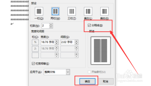 然后点击“栏”后,选择你需要编纂的栏数,在这里以两栏为例。确定