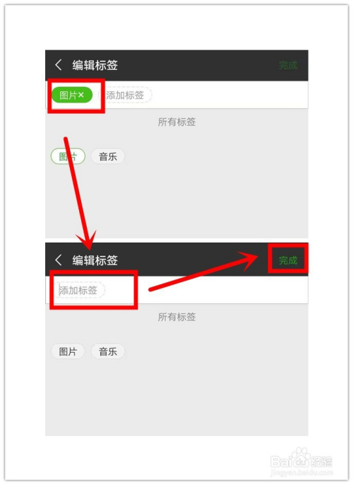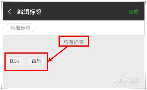 要删除微信保藏的一个标签(如下图所示中的“图片”、“音乐”标签),就需要在所有保藏项中,将该标签一一断根,也就是说,只要该标签没被任何一保藏项利用,即主动删除!