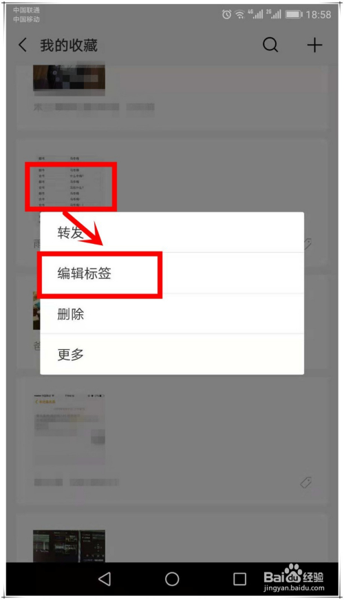 在列表中,找到要删除标签的保藏项,在上面用手指长按,弹出菜单中,选择“编纂标签”。
