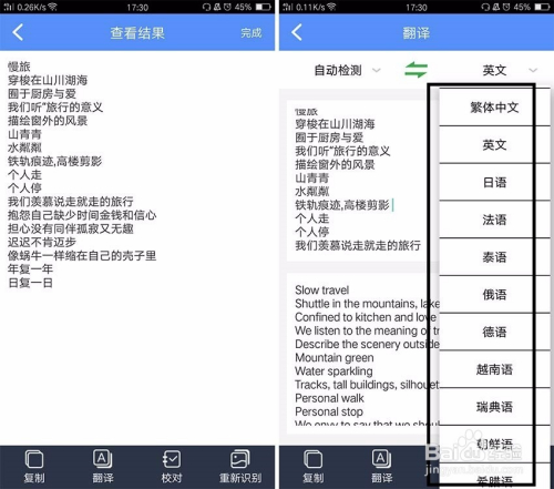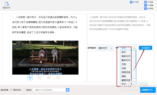 识别提掏出来的成果会呈此刻左边方框里面,这个时辰就需要翻译识别出来的文字了,在右边下拉框选择好想要翻译当作的说话,然后你会看到翻译当作的文字就会鄙人方显示了。