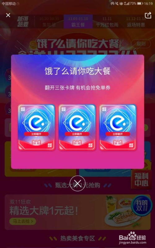如许,就会弹出“饿了么请你吃年夜餐”窗口,窗口有三张卡牌,可能会是“饿卡”,“么卡”,“了卡”,品质联盟红包,金币等奖品等。