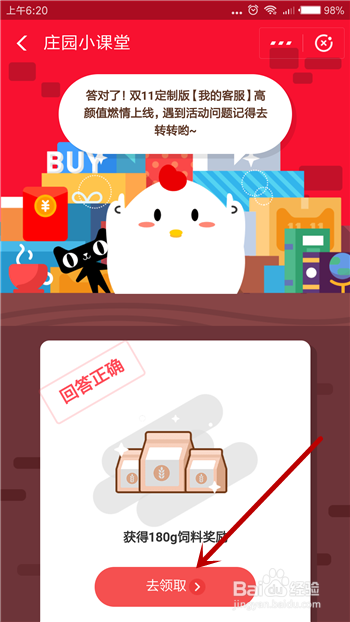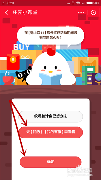 如许在进入庄园小讲堂就可以看到今天的答题,标题问题是在码上双11瓜分红包活动时代碰到问题怎么办,这个谜底是【去我的客服看看】,选择好后接着点击【确定】。