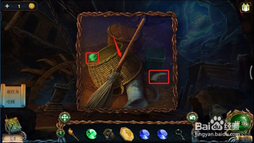 拿了三个线索后,继续往里走,在杂物堆那边拿到扫帚、绿宝石和角。