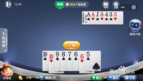 最壮大脑打出一对A,接着打出一张小王一张4,然后我打出一张10就过关了。