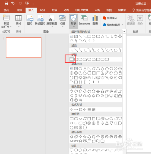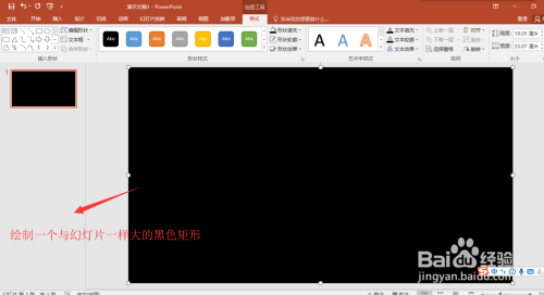 在插入菜单中找到外形号令,在浩繁的外形中找到矩形外形,然后在幻灯片页上绘制出一个和幻灯片页大小一致的矩形出来,并设置矩形的填充颜色为黑色。