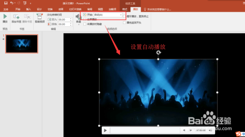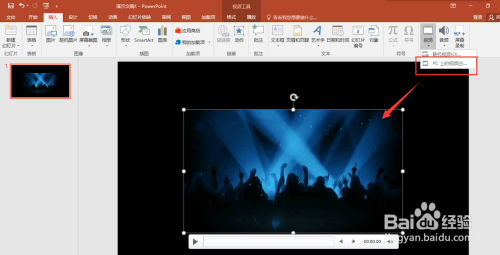 在插入菜单中选择插入视频,选择PC上的视频文件,然后将蹦迪的视频素材插入进来,调整好视频素材的大小,一般能笼盖住文本内容即可,然后选中视频,在格局中设置主动播放。