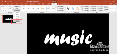 拖动鼠标左键将矩形和文本框一路选中,然后切换到格局菜单中,在格局中找到归并外形号令,执行归并外形中的剪除号令。