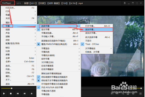 打开片子后,点击左上方的【PotPlayer】,鄙人拉列内外选择【字幕】,然后选择【选择字幕】,之后点击【添加字幕】。