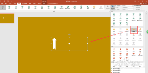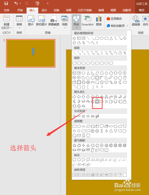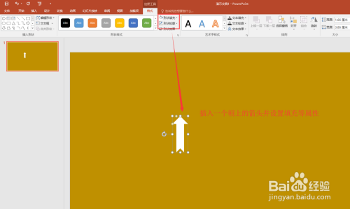 在插入菜单的外形中找到箭头汇总,选择一个箭头类型,然后在幻灯片页上绘制插入一个偏向朝上的箭头,并设置好箭头的填充与线条都为白色。