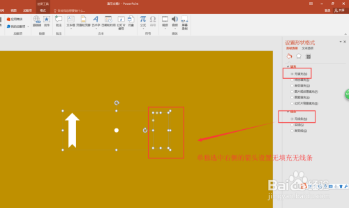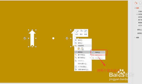 选中这两个箭头,右键执行组合号令,将这两个箭头组合到一路;然后在零丁选中右侧的箭头,设置右侧的外形格局为填充为无,线条为无。