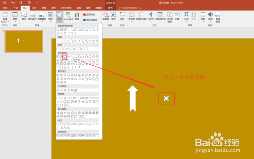 再次打开插入菜单,在插入菜单中找到外形中的椭圆,然后按住shift键在幻灯片页上绘制一个比力小的正圆出来,也设置正圆填充与线条为白色,接下来让箭头绕着白色圆为圆心做绕圆活动。