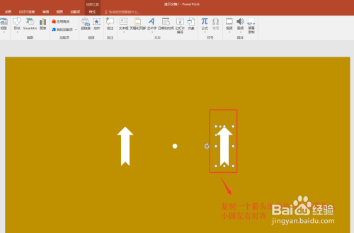 按住Ctrl键,移动左侧箭头复制一个箭头出来,并将复制的箭头移动的小圆的右侧,使得摆布两侧的两个箭头以小圆的对齐中间点摆布对齐。