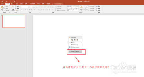 在新建或打开的PPT演示文稿的幻灯片页上右键鼠标,选择执行设置布景格局号令,为这个PPT幻灯片布景设置一个纯色的颜色填充,用来更好的区分动画结果。
