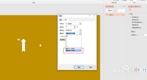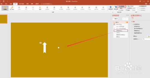 选中组合后的两个箭头,切换到动画菜单栏中,在动画菜单中选择添加动画,然后为其添加一个“陀螺旋”的动画结果,打开动画窗格,选择结果选项号令,在结果选项中切换到计时面板,设置反复为“直到幻灯片末从头至尾”。按F5播放预览动画,一个箭头环绕圆形扭转的动画建造完当作。