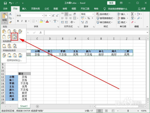 找到粘帖下的转置图标(带标的目的下和标的目的右的双标的目的箭头的文件板夹图标),点击一下。(鼠标在粘帖选项移动上时,表格里也会显示结果预览。如图所示)