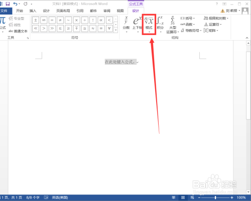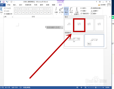 在菜单栏中的“公式东西”下面的“设计”中,找到本身要找的“根式”单击