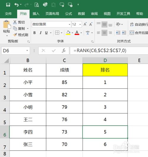 在D2单位格输入“=RANK(C2,$C$2:$C$7,0)”。