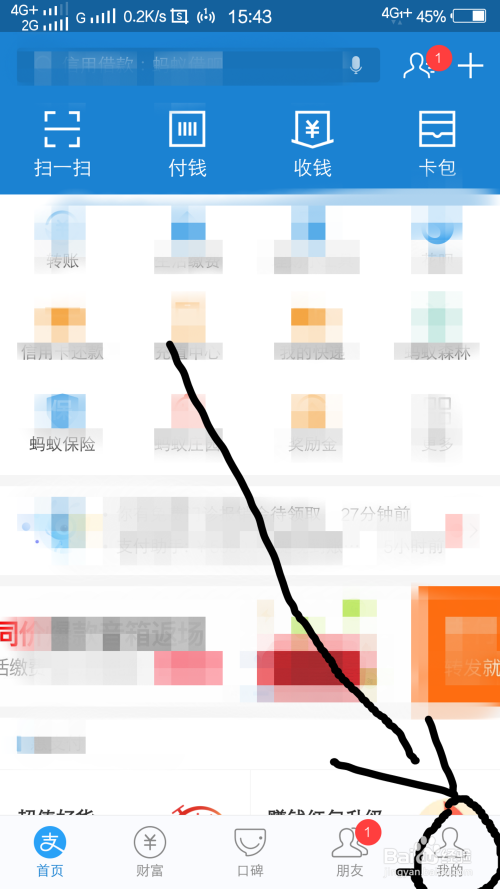 手机打开付出宝,会到付出宝的首页上,点击下方我的选项。