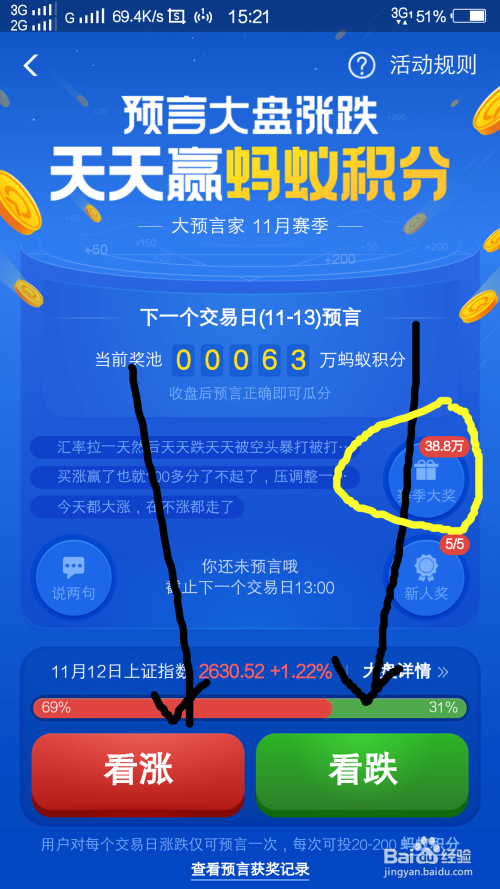 点进去猜涨跌之后就可以看到,会让你猜涨或者猜跌,选择你需要猜的点击投注。
