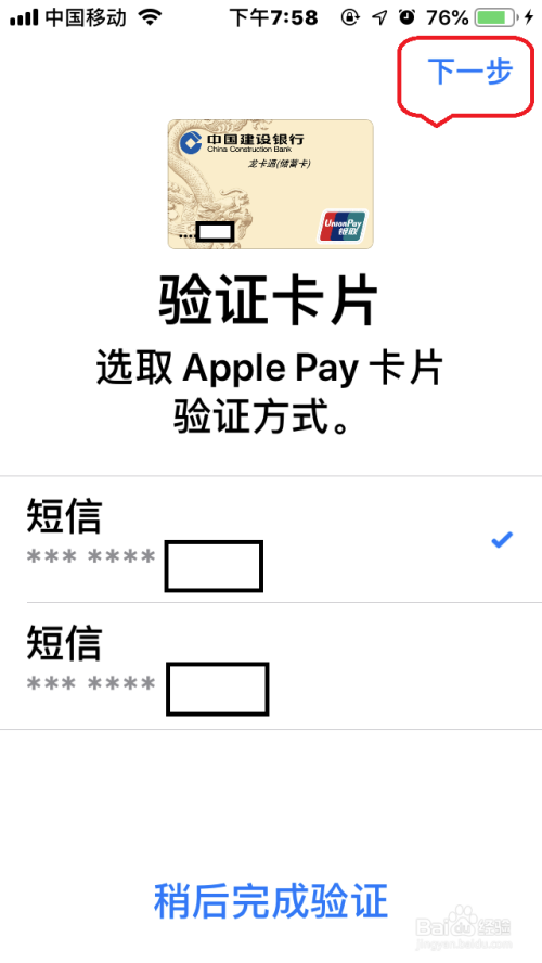 点击“下一步”,输入“短信验证码”即可验证添加银行卡至apple钱包。
