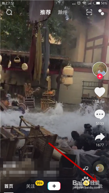 在打开抖音在播放视频界面的右下角找到并点击【我】选项。