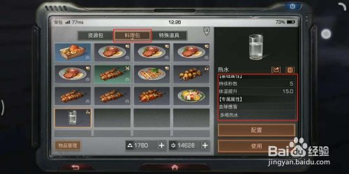 打开背包,选择摒挡包,选中热水,就可以看到热水的根本属性了,持续秒数:5,体温晋升:15.0,专属属性:去除伤风。热水可以在伤风的时辰利用,也可以在严寒的时辰利用