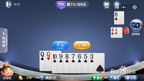 跑得快打出一对4,我打出一对Q,接着打出5-10顺子一张3就过关了。