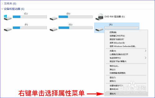 找到后,我们选中本身的U盘盘符,然后单击鼠标右键,在弹出的菜单中选择并点击“属性”菜单。
