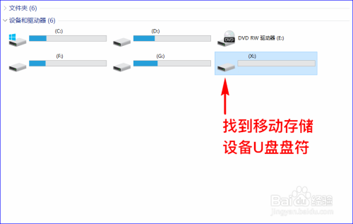 然后我们点击并打开“计较机(我的电脑)”,进入到计较机后,在里面找到我们插入的移动设备U盘盘符。
