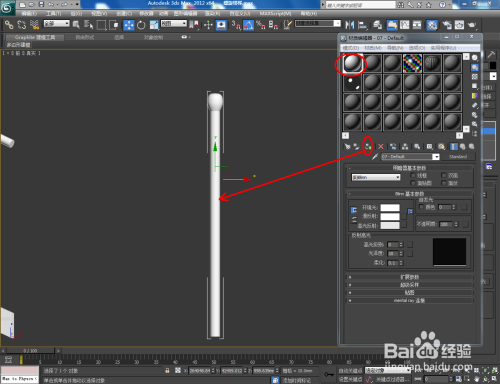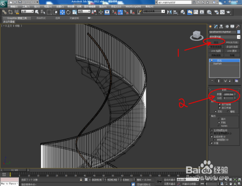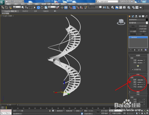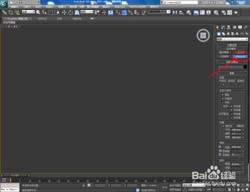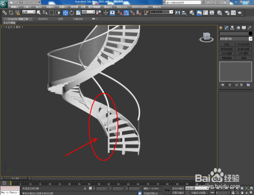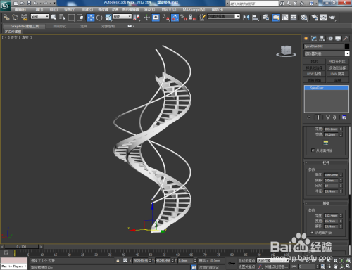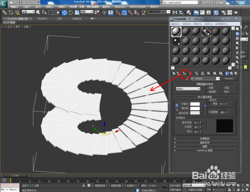 打开3Dmax2012软件,点击【建立】-【几何体】,下方的方框选择【楼梯】。点击【螺旋楼梯】,并在作图区域画出一个楼梯的根基体。选中楼梯,设置好右边【结构】和【梯级】的参数后,点击【材质编纂器】给楼梯附加一个白色材质球。;